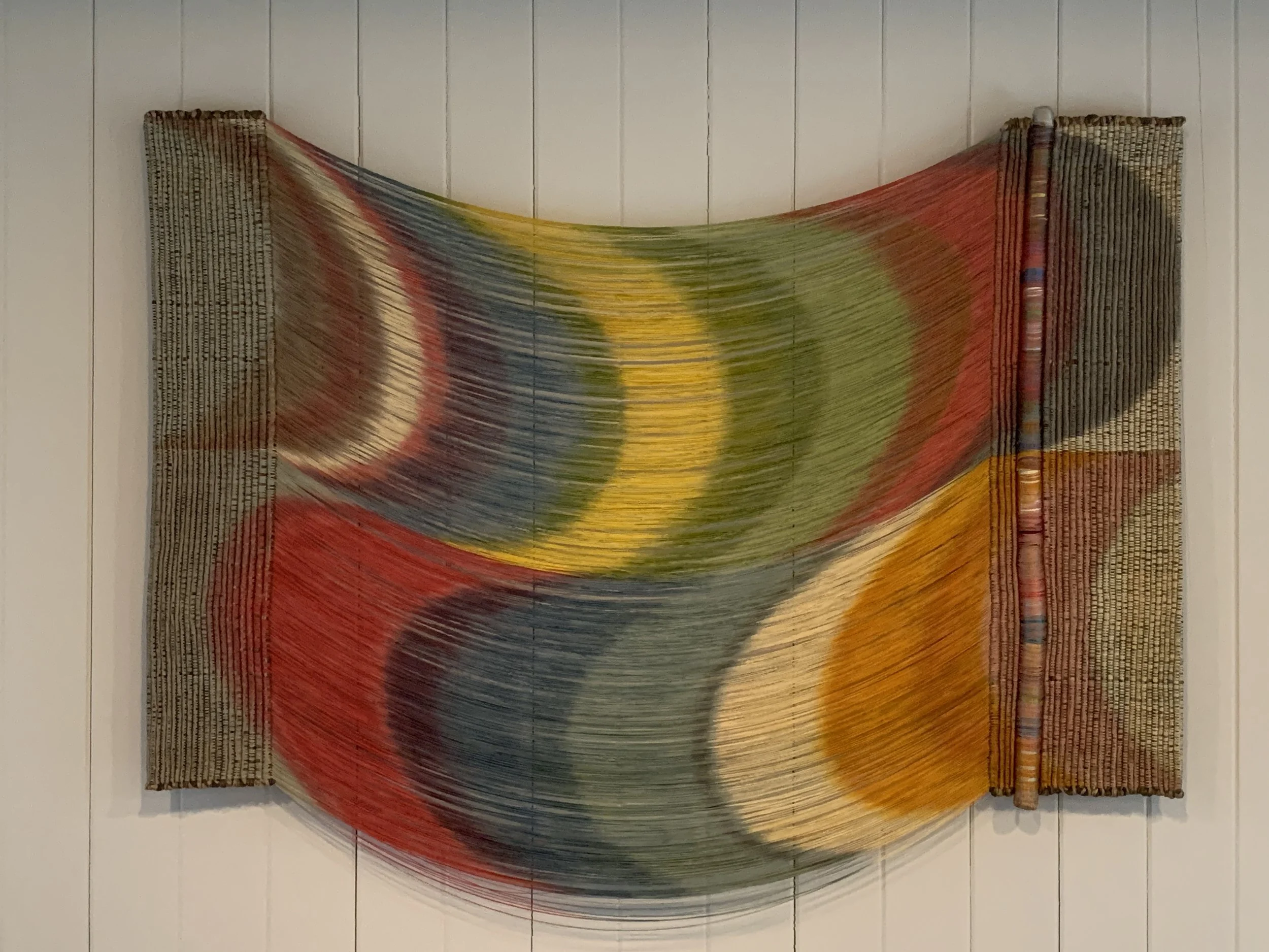 In the book Listening to the Thread, published in 1994, Asakura explains her influences and approaches to her work. As a child, she was profoundly affected by the parades held during Kyoto’s annual mid-summer Gion Festival. In this month-long festival that dates back to 869 AD, European tapestries, primarily from the 16th and 17th centuries, are used to ornament huge floats pulled through the streets by teams of people. These enormous tapestries influenced her approach to dyeing and weaving. As a young artist, Asakura began an extensive study of tapestry traditions around the world, including a year working and studying in the Netherlands. The constant interplay of these different traditions with her own is a hallmark of her work. She sees the structure of weaving as comparable to that of pointillism in painting, pointing out that colors never really mix together in textiles but keep their distinct colors. Combined with the effect of intercrossing warp and weft that create slight shadows at the point of intersection, the tapestry conveys a “visual symphonic wholeness” that “echoes in the distance.” Her work, like the Gion Festival floats, is best appreciated when viewed from a proper distance.