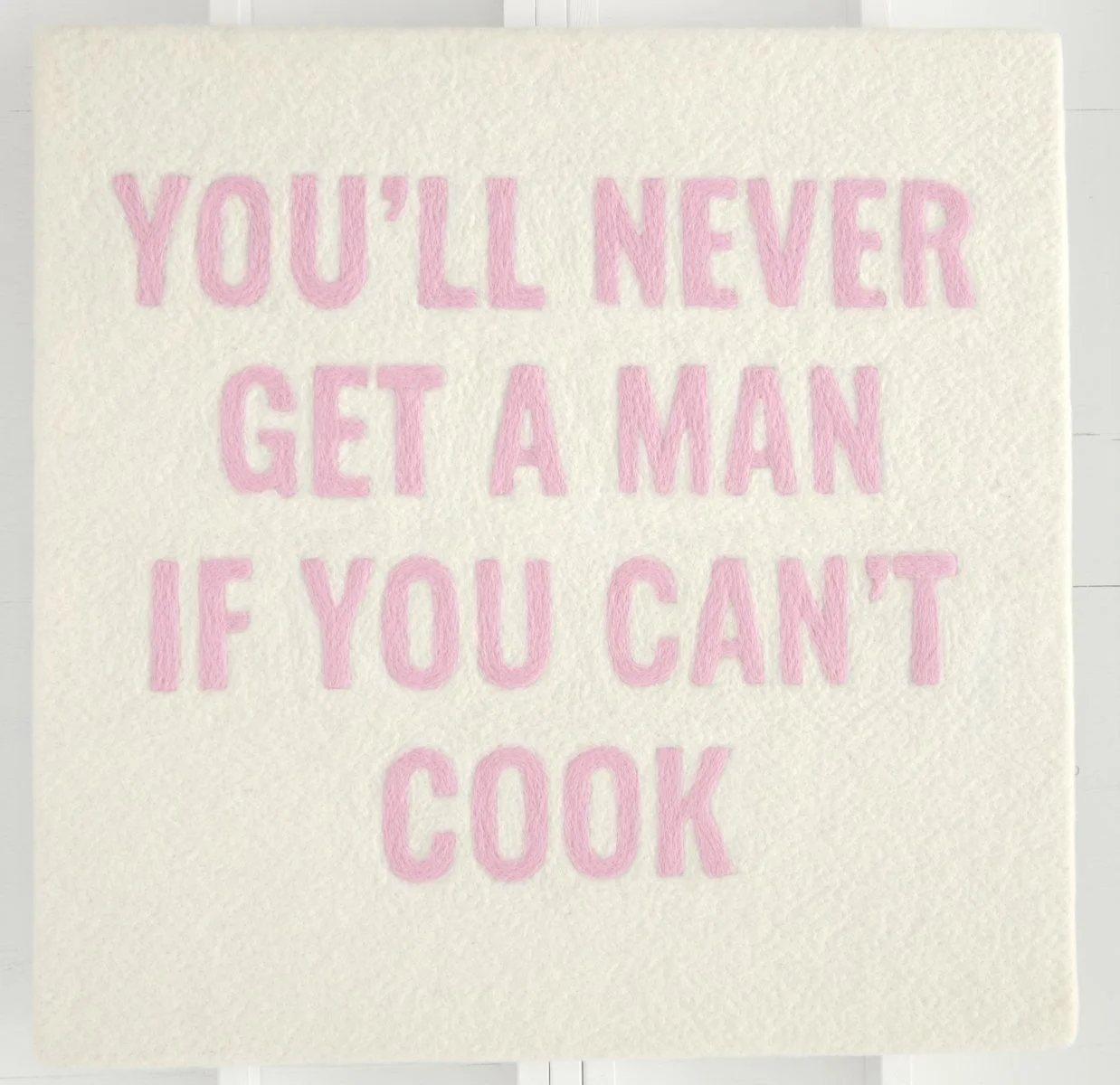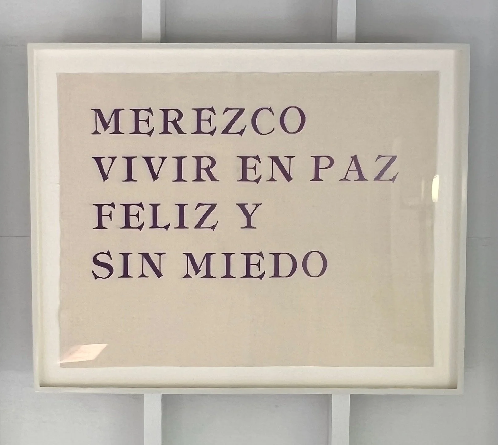 Though every artist is unique in her approach, each work in this exhibition challenges historic symbols of feminine gentility and conservatism, repurposing those symbols as inspiration and material for expressing modern ideas. Kelly Tapìa-Chuning transcribes problematic “truisms”—repeated to generations of women to define societal expectations and norms—into soft pink text that is needle-felted by hand. On the floor of the gallery, visitors will encounter Kelly’s pink American flag entitled What is Respect, an interactive piece encouraging people to walk across the flag in solidarity with women who are directly affected by the overturning of Roe v. Wade—wearing down the flag with every step. Lulu Varona revives her grandmother’s embroidery techniques to ornament fabric with progressive phrases written in Spanish like “Women should live in peace, happiness, and without fear.”