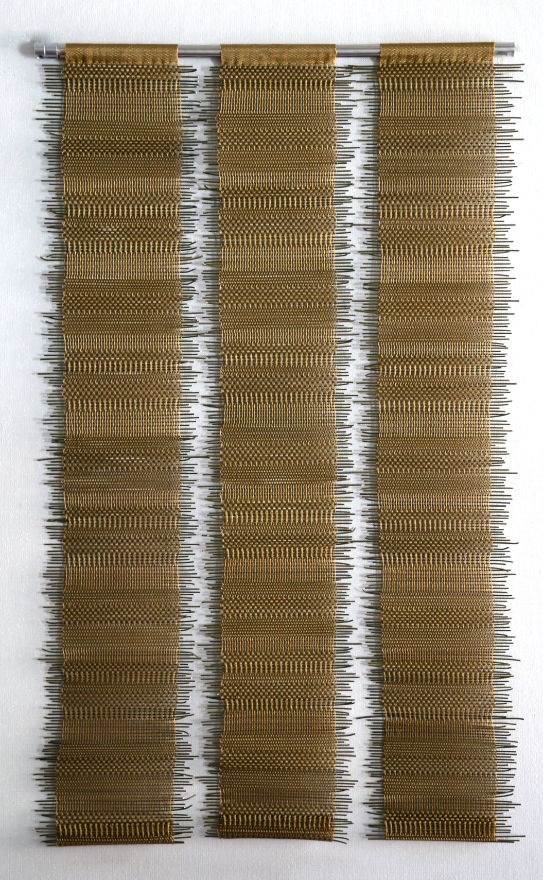 A fourth generation recycler, Suzanne Tick’s life work is centered around exploring new materials and reinventing manufacturing methods. Her hand woven textiles signify an effortless union between her age-old weaving techniques and the latest technology, solidifying her as a master of her craft. From the beginning, Tick spent summers in her father’s scrap recycling yard sorting metals and exploring the possibilities in the cast-offs of rural life. At the University of Iowa, Tick began as a printmaker, etching fabric and texture onto copper plates. She left as a weaver, combining materials both hard and soft. Tick’s life and work have always been a narration of balance and her woven works harness the struggles of life, resulting in textiles that are both delicate and strong. She investigates found materials. As Tick states, “weaving holds everything together, materials and life, successes and failures.”